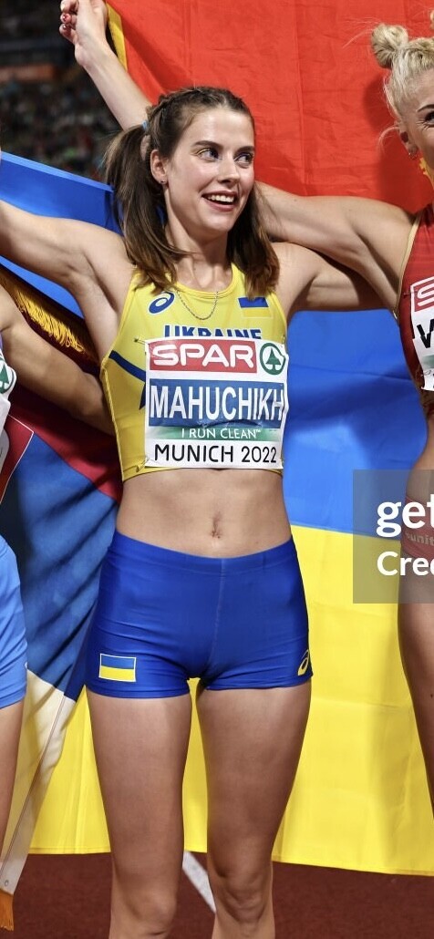 MUNICH, GERMANY - AUGUST 21: Bronze medalist Angelina Topic of Serbia, Gold medalist Yaroslava Mahuchikh of Ukraine, and Silver medalists Marija Vukovic of Montenegro celebrate after the Athletics - Women's High Jump Final on day 11 of the European Championships Munich 2022 at Olympiapark on August 21, 2022 in Munich, Germany. (Photo by Simon Hofmann/Getty Images for European Athletics)