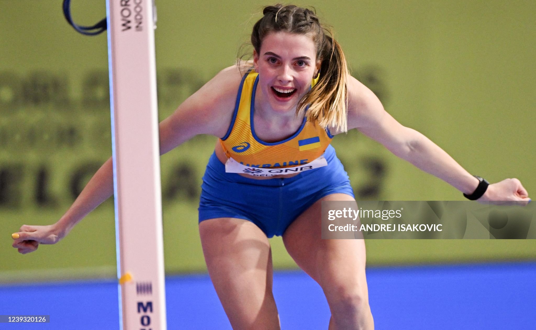 Winner Ukraine's Yaroslava Mahuchikh celebrates after victory in the women's high jump final during The World Athletics Indoor Championships 2022 at the Stark Arena, in Belgrade, on March 19, 2022. (Photo by ANDREJ ISAKOVIC / AFP) (Photo by ANDREJ ISAKOVIC/AFP via Getty Images)