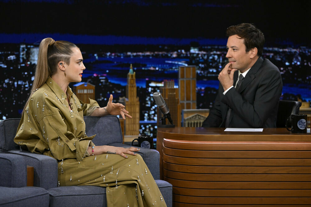 THE TONIGHT SHOW STARRING JIMMY FALLON -- Episode 1689 -- Pictured: (l-r) Actress Cara Delevingne during an interview with host Jimmy Fallon on Wednesday, July 27, 2022 -- (Photo by: Todd Owyoung/NBC)