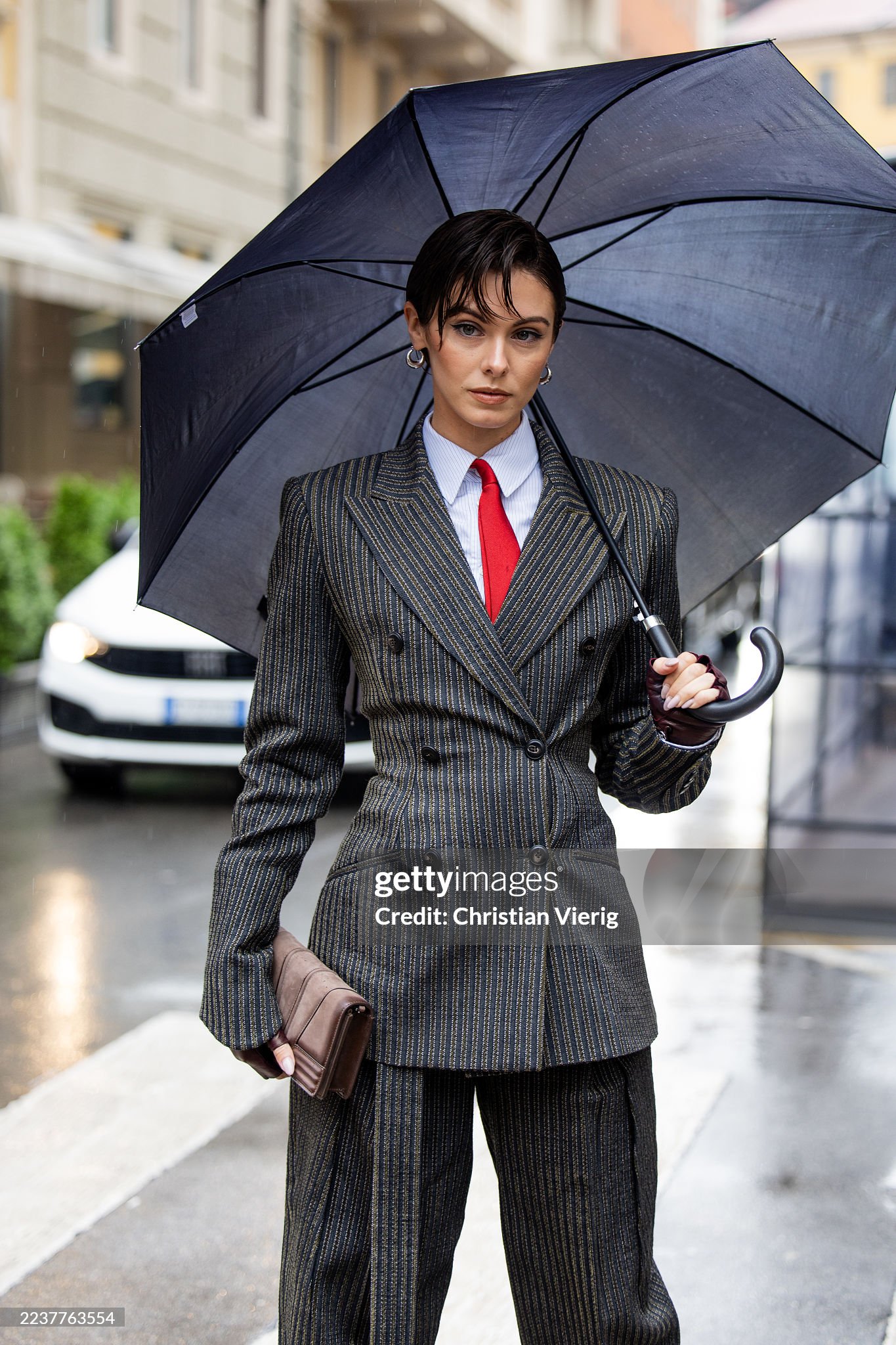 MILAN, ITALY - SEPTEMBER 27: Camella Rose wears black white tailored double breasted suit, red tie, white blouse outside Ferrari during the Milan Fashion Week Womenswear Spring/Summer 2026 on September 27, 2025 in Milan, Italy. (Photo by Christian Vierig/Getty Images)