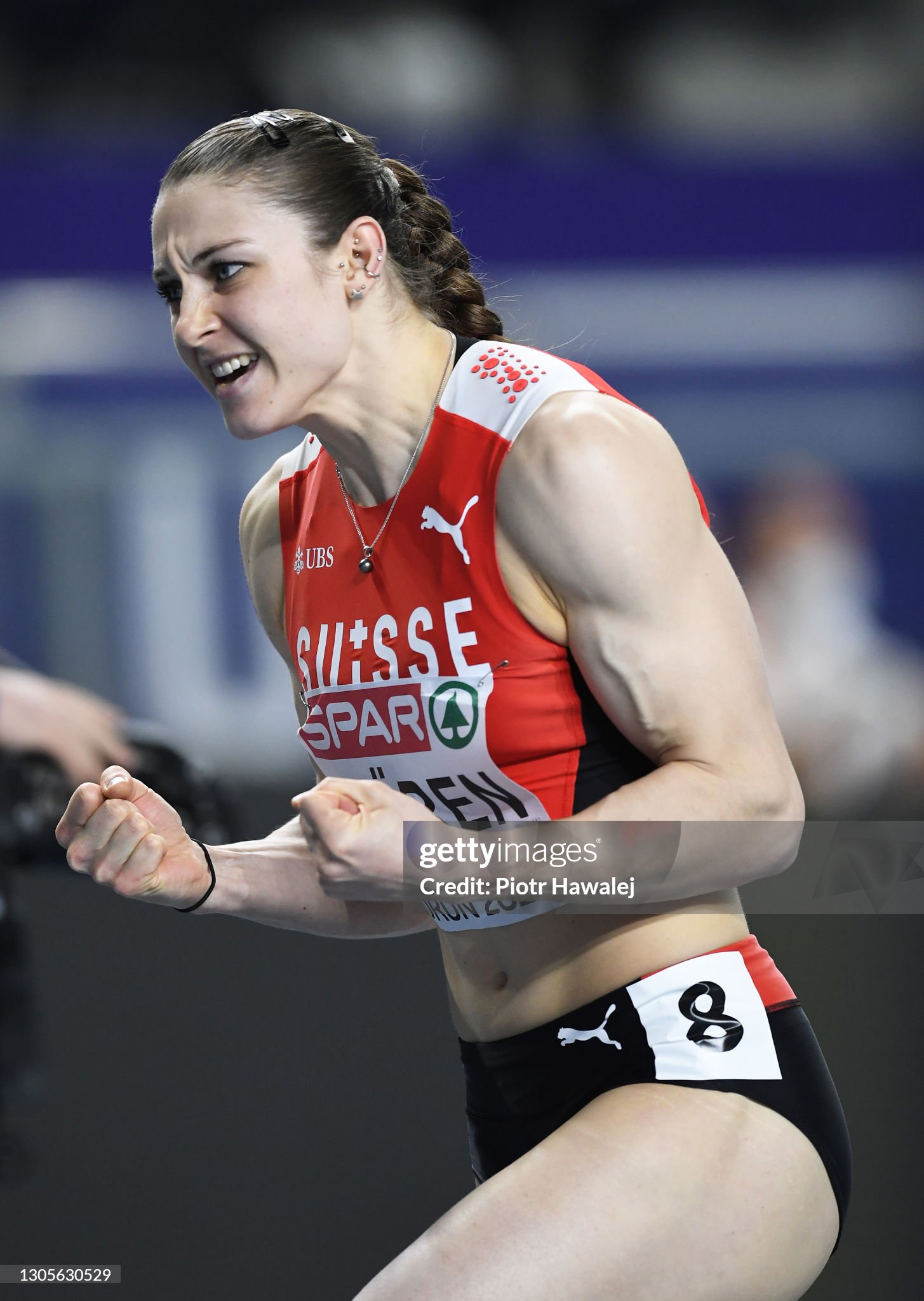 TORUN, POLAND - MARCH 06: Noemi Zbaeren of Switzerland celebrates after her run in Women's 60 Metres Hurdles during the first session on Day 2 of European Athletics Indoor Championships at Arena Torun on March 06, 2021 in Torun, Poland. Sporting stadiums around Poland remain under strict restrictions due to the Coronavirus Pandemic as Government social distancing laws prohibit fans inside venues resulting in games being played behind closed doors. (Photo by Piotr Hawalej/Getty Images)