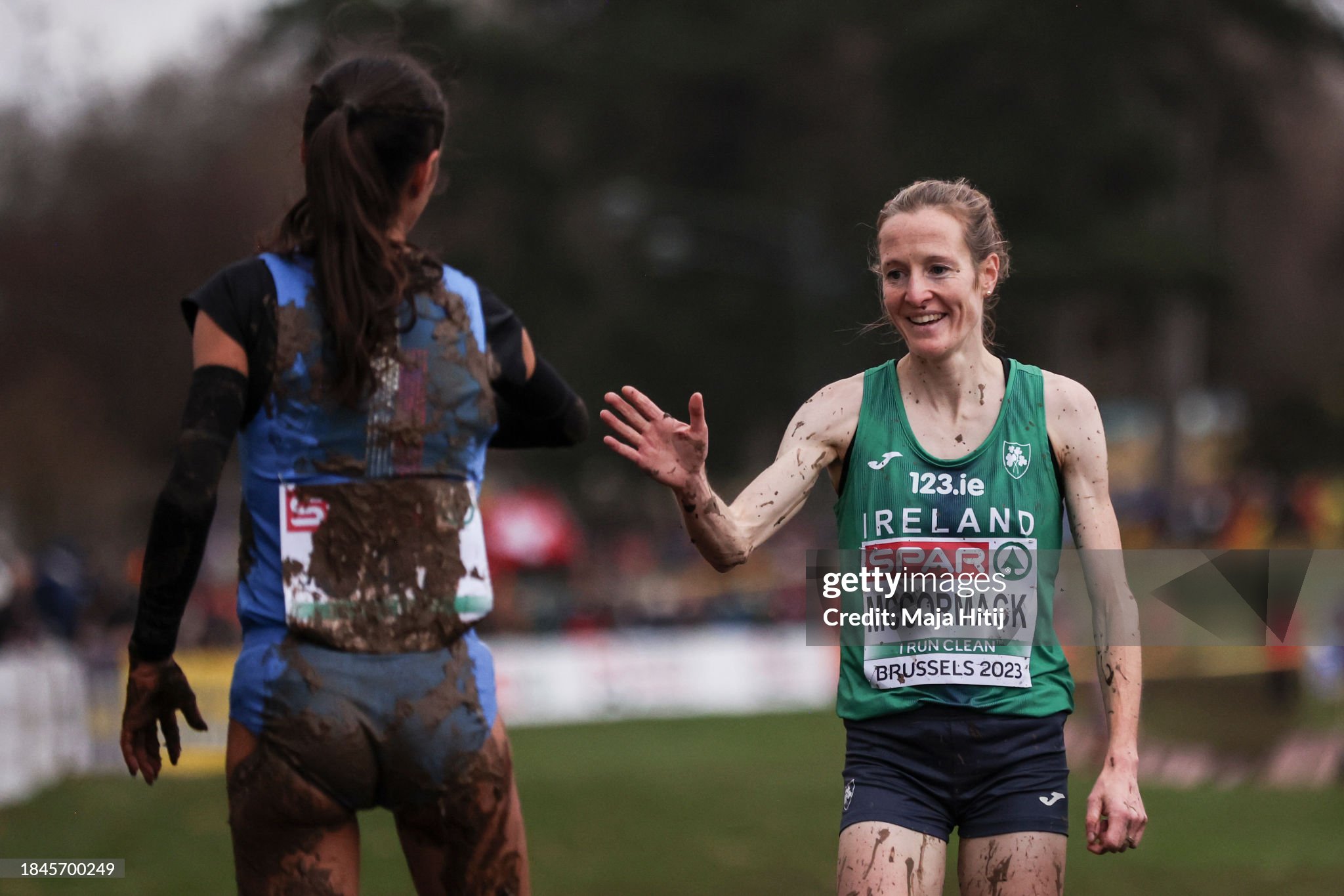 BRUSSELS, BELGIUM - DECEMBER 10: Nadia Battocletti of Iatly celebrates with Fionnuala McCormack of Ireland after finishing second at the Senior Women's race during the SPAR European Cross Country Championships 2023 on December 10, 2023 in Brussels, Belgium. (Photo by Maja Hitij/Getty Images for European Athletics)