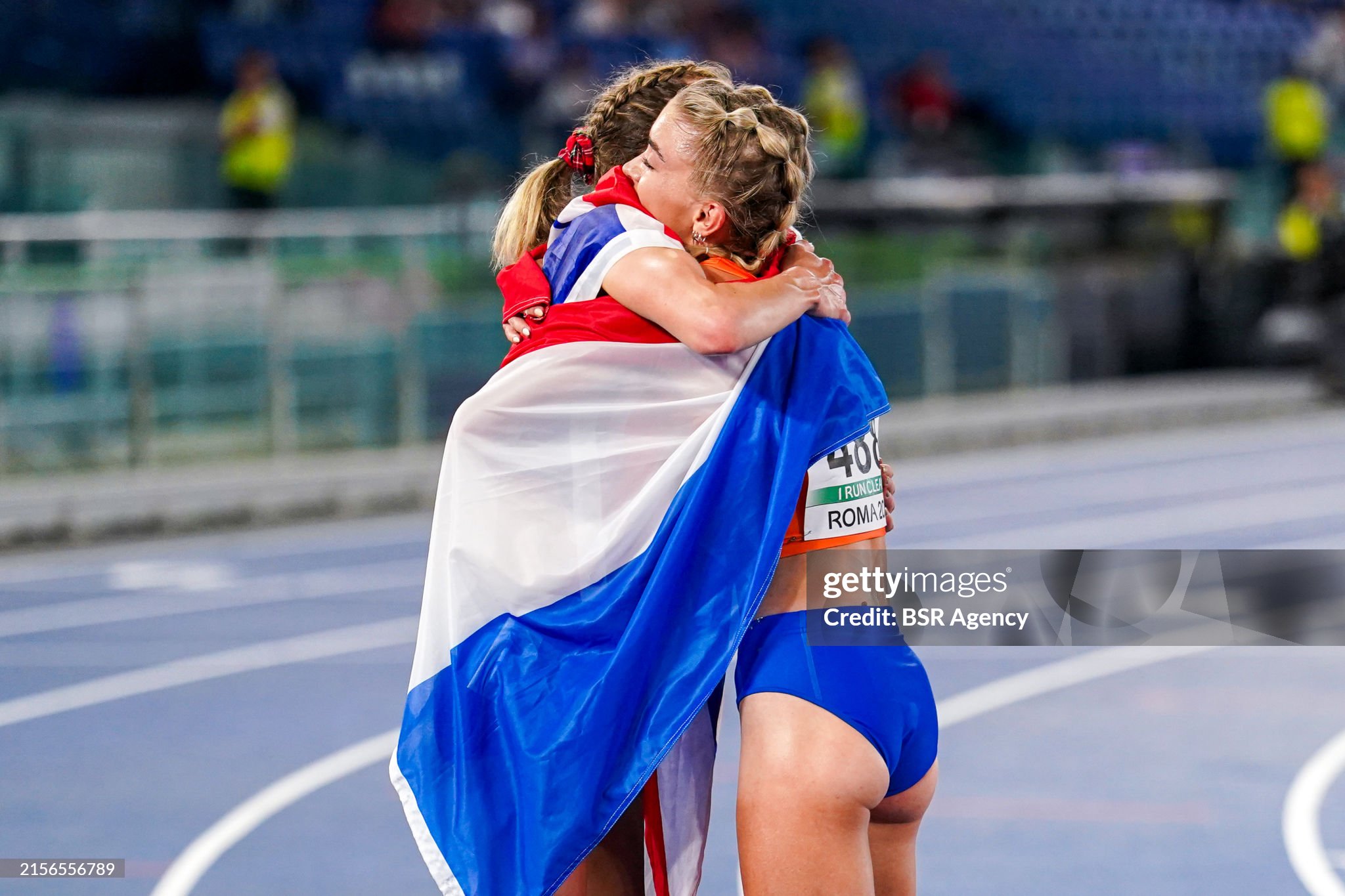 ROME, ITALY - JUNE 11: Diane Van Es of?the Netherlands celebrating second place (silver medal) and holding flag after competing in the 10000m Women Final during Day Five of the European Athletics Championships - Rome 2024 at Stadio Olimpico on June 11, 2024 in Rome, Italy. (Photo by Joris Verwijst/BSR Agency/Getty Images)