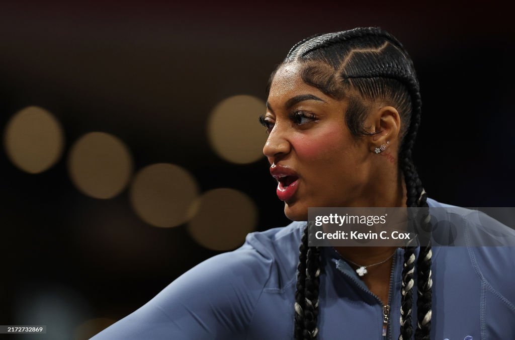 COLLEGE PARK, GEORGIA - SEPTEMBER 17: Angel Reese #5 of the Chicago Sky reacts during player intros prior to facing the Atlanta Dream at Gateway Center Arena on September 17, 2024 in College Park, Georgia. NOTE TO USER: User expressly acknowledges and agrees that, by downloading and or using this photograph, User is consenting to the terms and conditions of the Getty Images License Agreement. (Photo by Kevin C. Cox/Getty Images)
