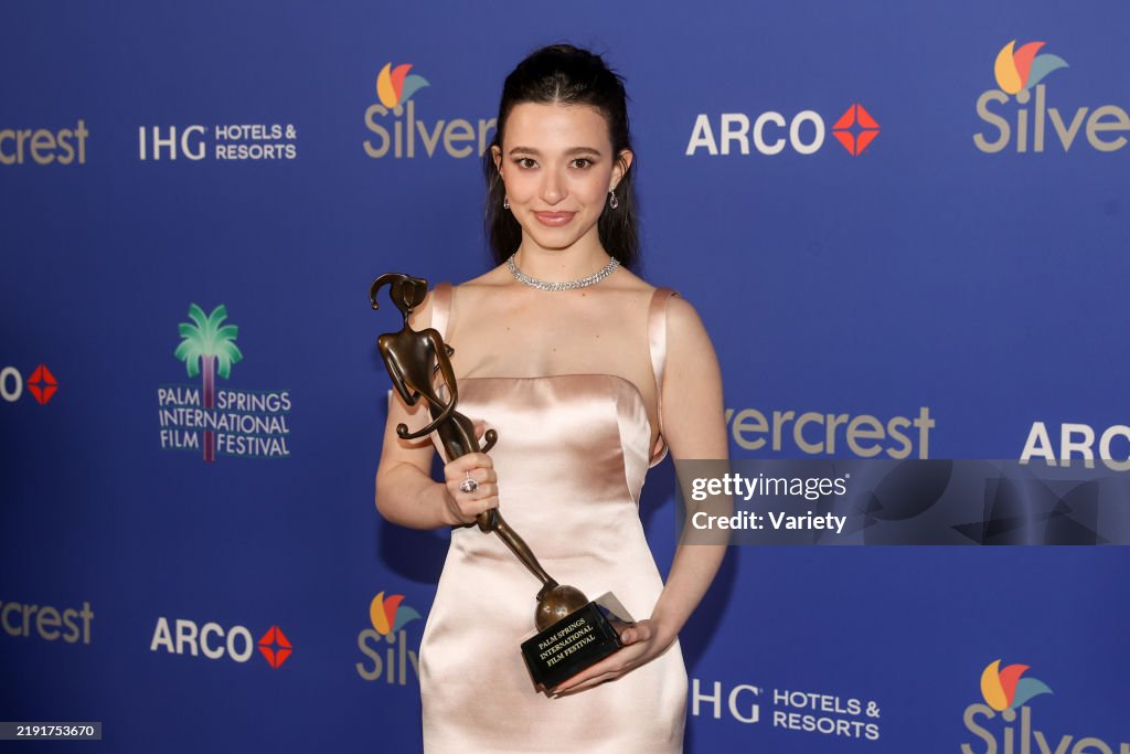 Mikey Madison Actress, poses with the Breakthrough Performance Award at the 36th Annual Palm Springs International Film Awards at the Palm Springs Convention Center on January 3, 2025 in Palm Springs, California. (Photo by Chad Salvador/Variety via Getty Images)
