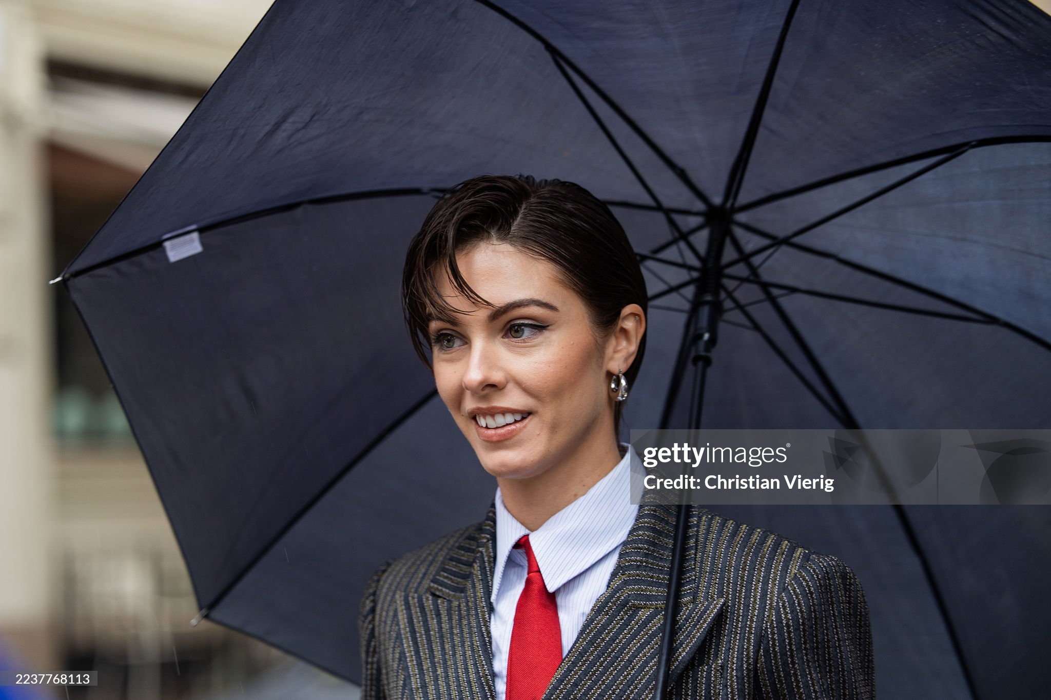 MILAN, ITALY - SEPTEMBER 27: Camella Rose wears black white tailored double breasted suit, red tie, white blouse outside Ferrari during the Milan Fashion Week Womenswear Spring/Summer 2026 on September 27, 2025 in Milan, Italy. (Photo by Christian Vierig/Getty Images)