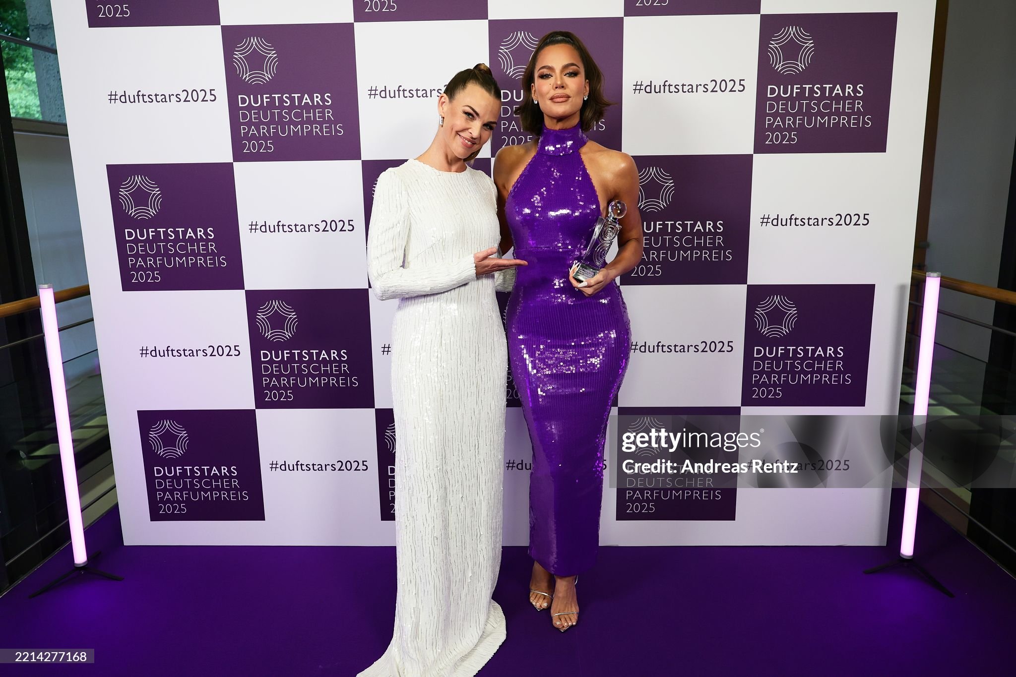 DUESSELDORF, GERMANY - MAY 08: Annika Lau and Khlo? Kardashian pose with the award at the annual German Perfume Award Duftstars at Rheinterrasse on May 08, 2025 in Duesseldorf, Germany. (Photo by Andreas Rentz/Getty Images for Fragrance Foundation )