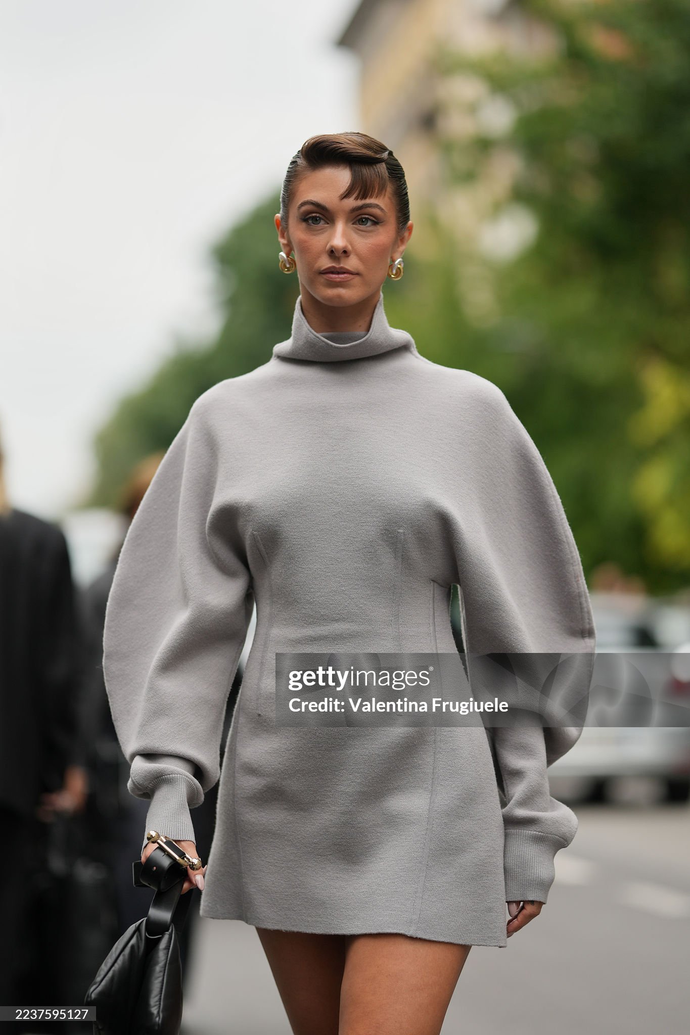 MILAN, ITALY - SEPTEMBER 26: Carmella Rose wears a sleek dark brown updo with a sculpted curled fringe, gold hoop earrings, a black leather top-handle bag with gold hardware, a light grey knit turtleneck mini dress with voluminous balloon sleeves, fitted waist and long fitted cuffs, outside Sportmax, during Milan Fashion Week - Womenswear Spring/Summer 2026, on September 26, 2025 in Milan, Italy (Photo by Edward Berthelot/Getty Images)