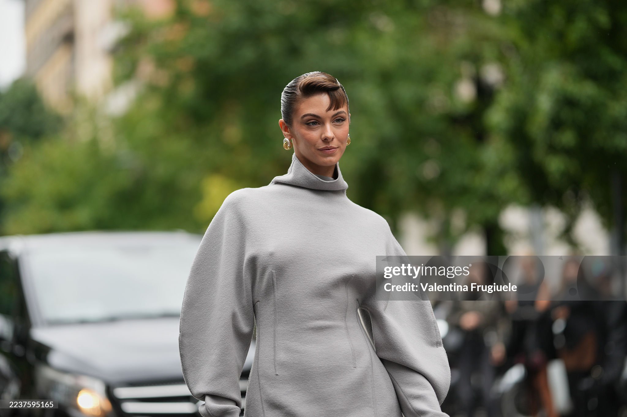 MILAN, ITALY - SEPTEMBER 26: Carmella Rose wears a sleek dark brown updo with a sculpted curled fringe, gold hoop earrings, a black leather top-handle bag with gold hardware, a light grey knit turtleneck mini dress with voluminous balloon sleeves, fitted waist and long fitted cuffs, outside Sportmax, during Milan Fashion Week - Womenswear Spring/Summer 2026, on September 26, 2025 in Milan, Italy (Photo by Edward Berthelot/Getty Images)